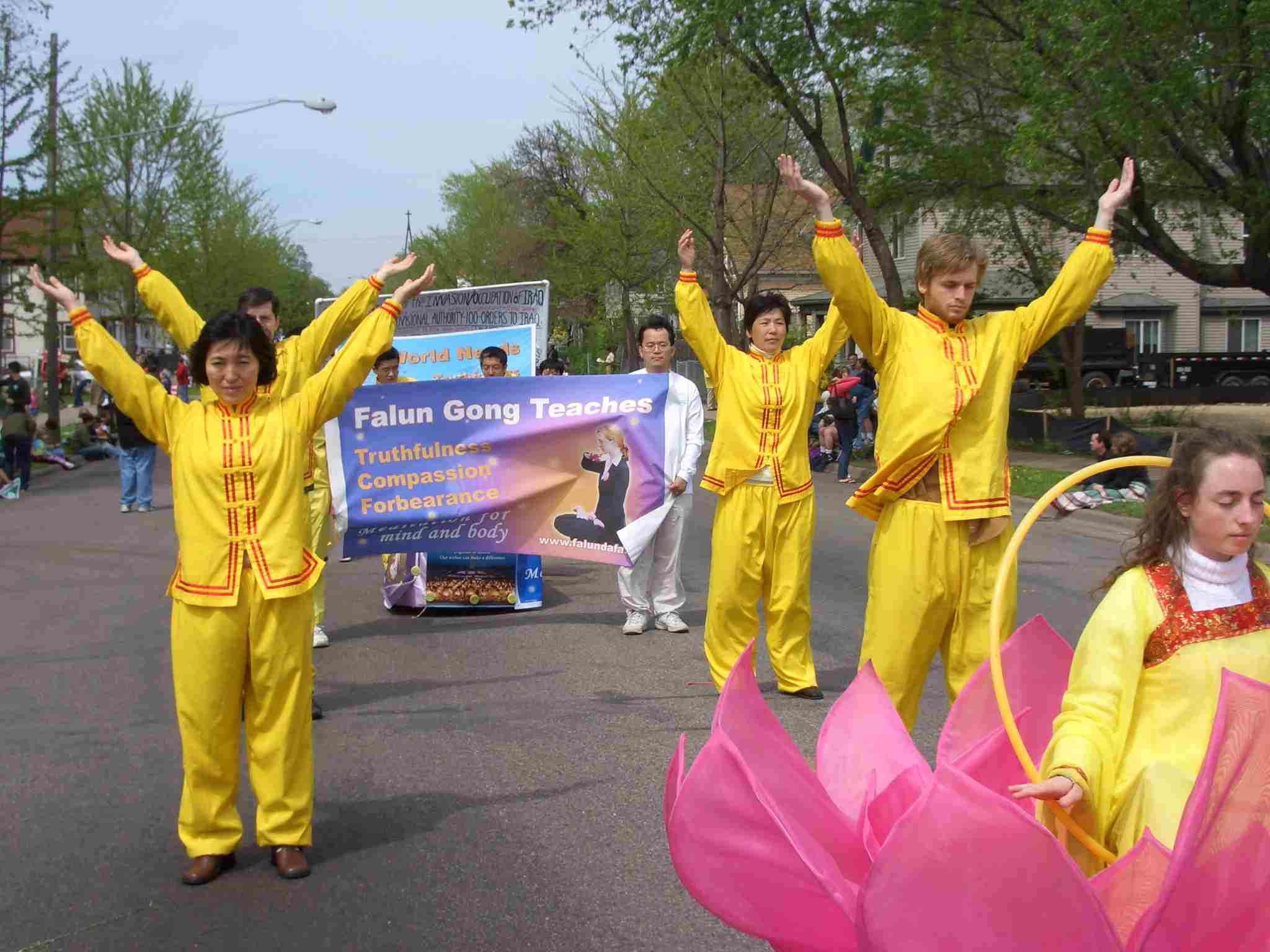 【明慧网二零零七年五月十二日】美国明尼苏达州五月节游行(MayDay Parade)是一年一度的盛大游行之一,于每年五月第一个星期天举办,每年有两千人参与游行,参观人数更是数以千计。法轮功团体每年都参加这个活动,今年也不例外。二零零七年五月六日,参加游行的学员们利用横幅传达法轮功“真善忍”的福音,并且展示动功和静功。身着仙女服的学员和小弟子散发资料和书签,把大法的美好传递给成千上万的观众们。