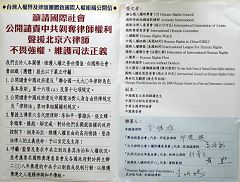 二零零三年十月二十五日,台湾最大的律师公会「中华民国律师公会全国联合会」发表一份联合声明,支持法轮功学员对大陆镇压者江泽民提出的国际人权诉讼,并呼吁尽速释放被拘留的台湾学员,这是全球第一个表态支持法轮功「诉江案」的律师界团体。拥有四千名以上会员的「全联会」,当日讨论十八位会员律师代表在九月七日联署之「呼吁立即停止镇压法轮功、支持诉江之人权诉讼」提案,经理监事们热烈讨论法轮功人权提案,最后全体通过,并发表联合声明。
