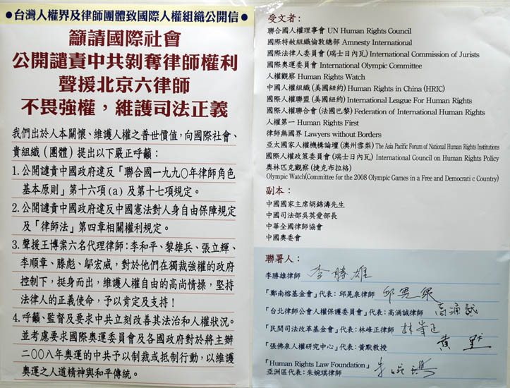 为了声援北京六大律师为法轮功学员做公开无罪辩护,CIPFG亚洲分团副团长、郑南榕基金会董事长邱晃泉律师邀集台湾著名人权律师于二零零七年五月五日召开记者会,要求国际社会公开谴责中共剥夺律师权利;具体声援北京六律师维护司法正义;要求中共立即释放无罪被非法关押的法轮功学员,停止对宗教信仰自由的迫害。