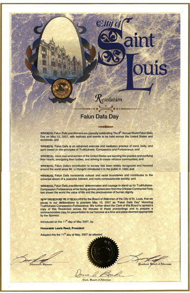 鉴此,圣路易市市议会特此褒奖二零零七年五月十三日为颂扬真、善、忍的“法轮大法日”。