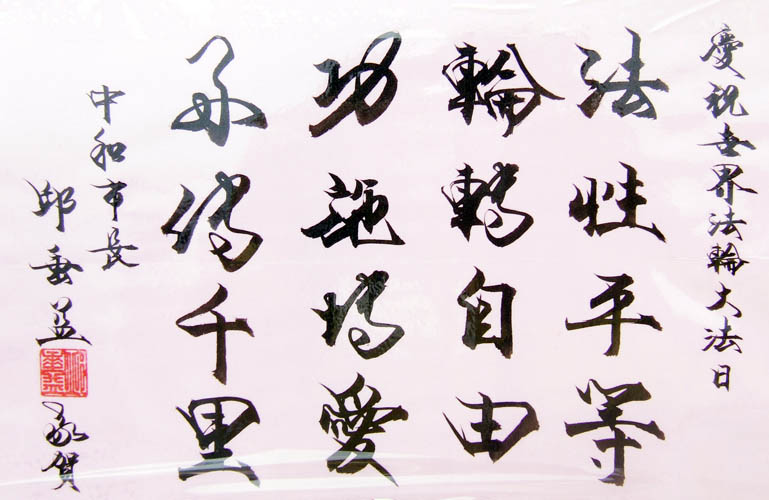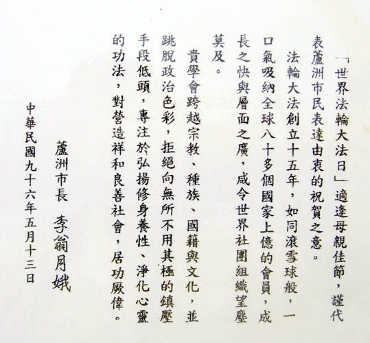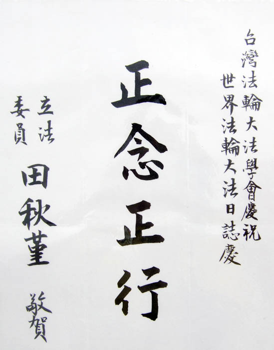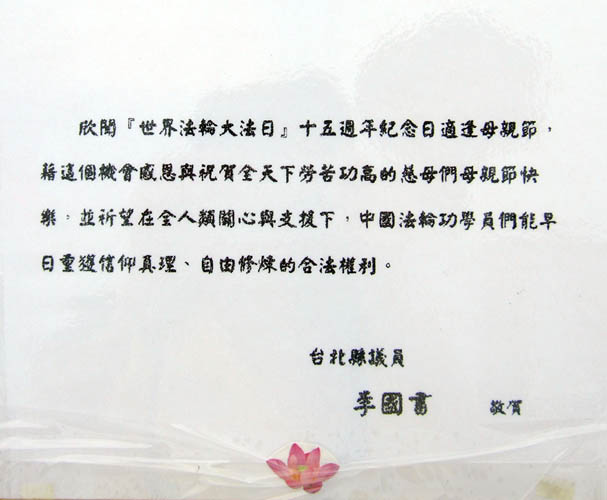 陈女士正看着政要的祝贺,接受采访时表示,她是看了媒体报导法轮功今天在中正纪念堂办活动特地从基隆来参观的。她说从小就跟着奶奶父母去庙宇烧香拜佛,结了佛缘,对修身道德提升有兴趣,今天想来了解法轮功这修炼法门与炼功,接触善缘。她愿学员们加油;同时也希望自己有缘能来炼法轮功。