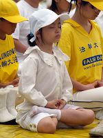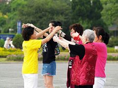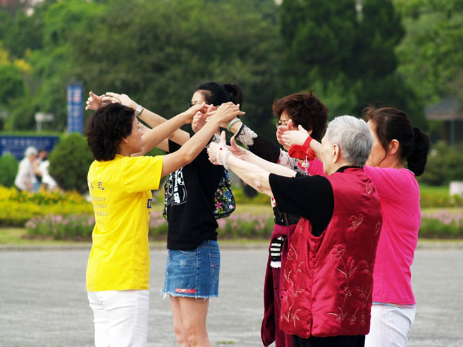 ![]() 了解法轮功后,有兴趣的民众现场就学起功来了 |