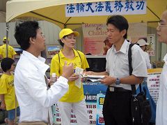 一位带着妈妈和妹妹来参加其它团体活动的年轻人,特地到摊位要了很多资料,并跟妈妈说,法轮功很有名,他要好好研究。
