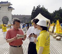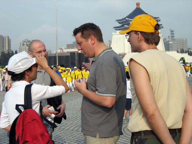 星期日的中正纪念堂有很多外国游客,不论他们过去听说过法轮功与否,都对法轮功产生高度的兴趣,他们看了排字,记下法轮功的网址后表示,回去一定会上网去找法轮功的资料。