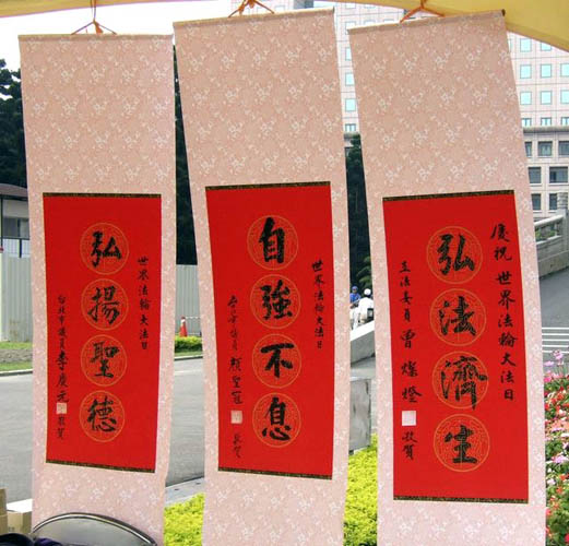 法轮大法学会副理事长黄春梅表示,一九九二年的五月十三日,李洪志先生将法轮大法公诸于世。十五年来,法轮功洪传到世界八十多个国家地区,使上亿人身心受益。台湾是除了中国大陆以外法轮功学员最多地方,为了庆祝这个伟大的日子,学员以排字来表达对师父的敬意,上午先排出「恭祝师尊生日快乐」,下午排出「五一三世界法轮大法日」,现场同时展示法轮大法弟子证实法摄影展及真善忍美展。