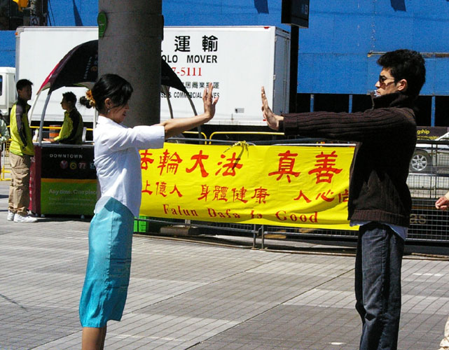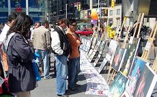 ![]() 法轮功真相图片展吸引路人来了解真相 |