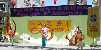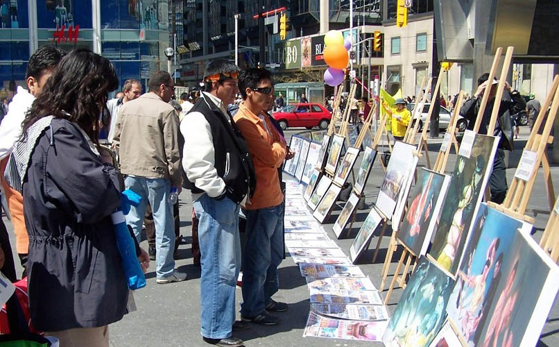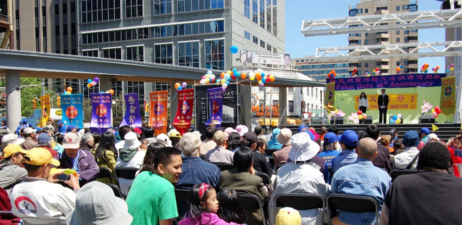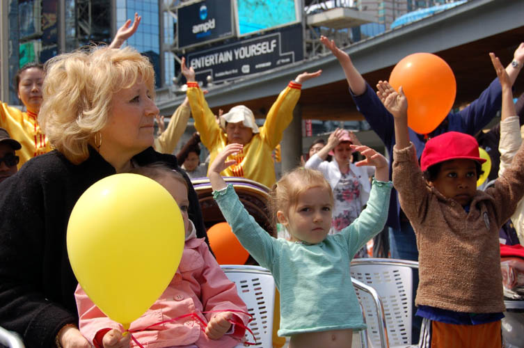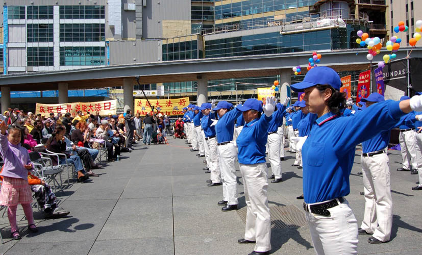 今天多伦多的阳光明媚,法轮功学员以音乐、歌舞,诗歌等形式,表达对师父、大法的歌颂和感激。广场上还有法轮功真相图片展,很多路人被吸引,有人已经在跟学员学习炼功动作。
