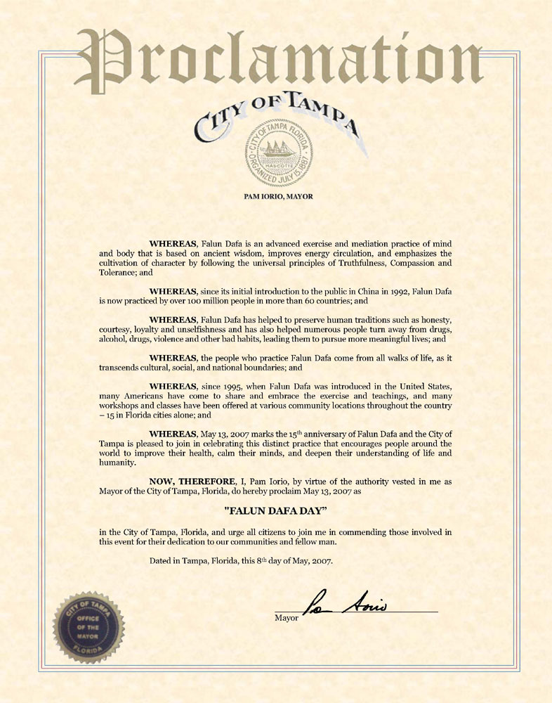 鉴于,二零零七年五月十三日标志法轮大法洪传十五周年,坦帕市很高兴在此刻共同庆祝这一与众不同的,鼓励世界上的人们改善健康,净化心灵,更加深刻的了解人类生命的功法。