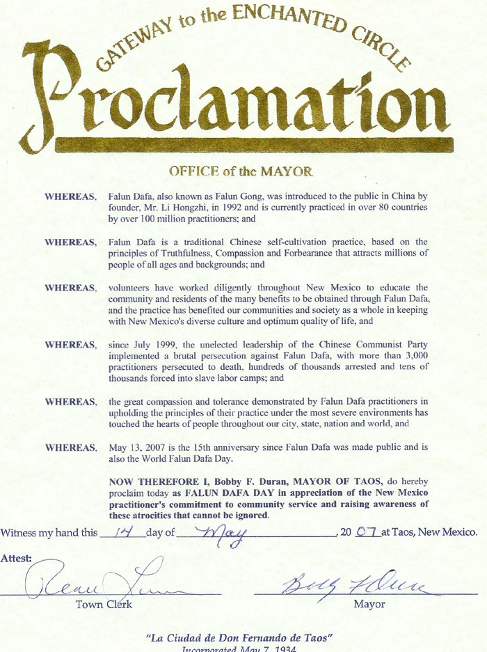 鉴于,新墨西哥的自愿者们努力的将修炼法轮大法的益处告诉社区居民,为了保持新墨西哥的多元文化和最佳的生活质量,我们的社区和社会已经受益于法轮大法;并且