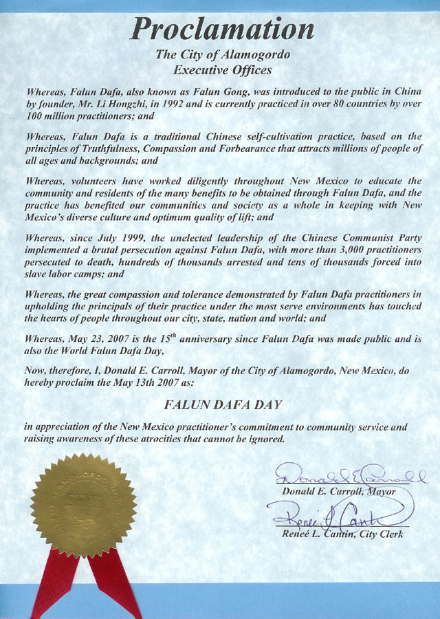 鉴于,新墨西哥的自愿者们努力的将修炼法轮大法的益处告诉社区居民,为了保持新墨西哥的多元文化和最佳的生活质量,我们的社区和社会已经受益于法轮大法;并且