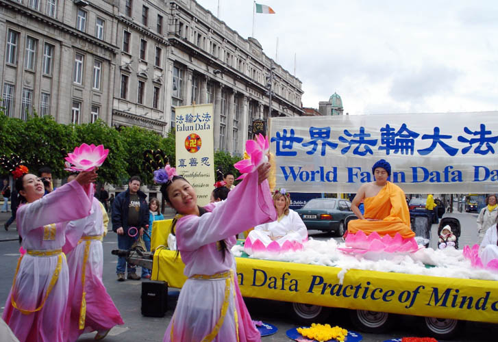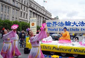 游行队伍由横幅、花车、仙女队三部份组成,向世人展现着大法的美好。走在前面的是手持“法轮大法好”横幅、“真善忍”花匾的法轮功学员。中间的花车莲花座上端坐一位佛扮相的法轮功学员,庄严而神圣。另四位法轮功学员在小莲花座上演示着法轮大法的功法。仙女队展示着具有中国传统文化底蕴的“莲花舞”和“扇子舞”,受到爱尔兰民众的热烈欢迎。