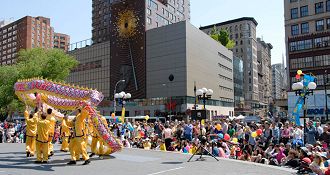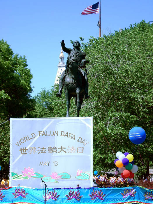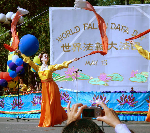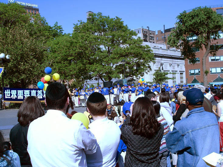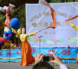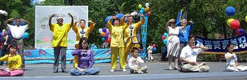 灿烂的阳光下,和煦的微风中,男女主持人分别用中英文向四方嘉宾介绍今天这个特别的日子——“五月十三日,世界法轮大法日”,邀请随缘而来的纽约人和大法弟子一起欢庆这个伟大的日子。