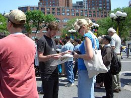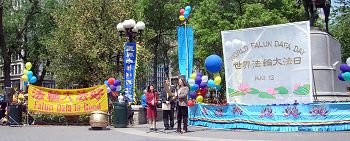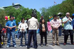 数位西方学员拿起话筒,和纽约人分享他们修炼法轮大法的感受。他们表示修炼后在工作上更加专心致志,学习能力也得到提高,对家人更加宽容忍耐,对孩子也变的耐心。同时呼吁纽约人帮助制止在中国大陆中共对法轮功学员的残酷迫害。