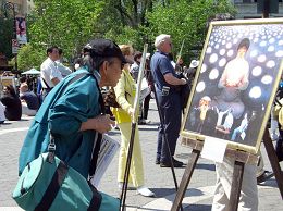 ![]() 不断有市民凑近,细观法轮功艺术家的美术作品 |