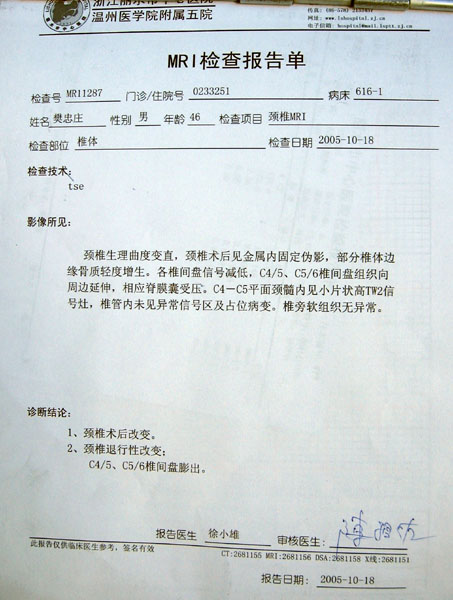 让人愤愤不平的是:缙云公安局副局长杨长春竟说:这份鉴定是个天文数字,要赔就给你十万元人民币,但必须先预付20年的利息…我说你这是在耍流氓,你那种恶从胆边生的霸道行为,是一个十十足足的无赖!你们还指使丽水医院,停止为樊中庄用药、治病;樊夫人自去年八月以来,在医院为侍候樊先生的保姆费至今分文未付;司法鉴定共花4200元,也由本人出,(那是四月份初稿写就时的情况,五月以来当局又让医院用药了,但只字不提这笔赔偿费)。