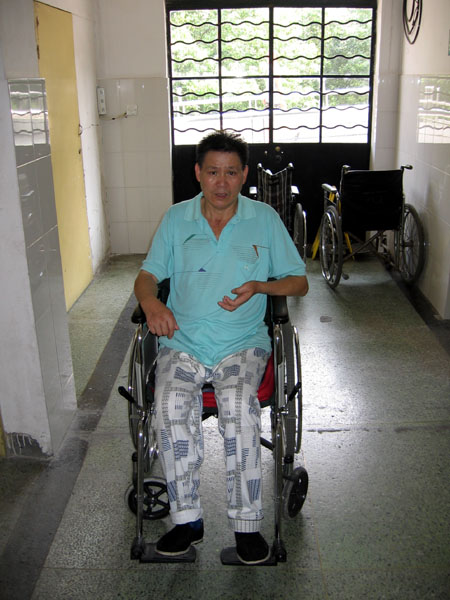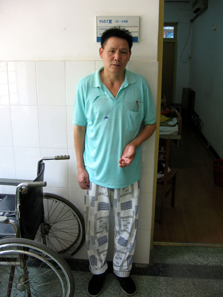 原本身体健壮的樊中庄先生,在经受多次牢狱之灾未曾将他身体摧垮,如今在本乡本土的当地,却被这些恶警们的酷刑摧残,变成了依赖轮椅伴随终生的残废人了。记得2004年12月,出狱不久的樊中庄先生,风风火火刚从北京上访回来,赶来我家探望我这个狱中的生死之交,我看到他充满活力、精神饱满不由得为他庆幸没被监狱摧垮,而今看到他必须依靠家人搀扶才能站立的照片,拐着的左手很明显是残废人,相比之下竟是面目全非,判若两人。恶警们你们竟敢对一位抬头不见低头见、乡里乡亲的本乡人下此毒手,看来完全丧尽人性,变成禽兽不如的畜生了。