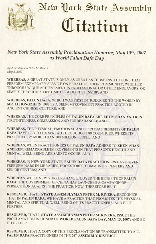 鉴于,虽然纽约人享受到法轮大法的益处,但中共政权却对这个功法进行迫害;因此现决定,我,州议员彼得•瑞沃拉,褒奖法轮大法是一个提高学员身心健康的功法;