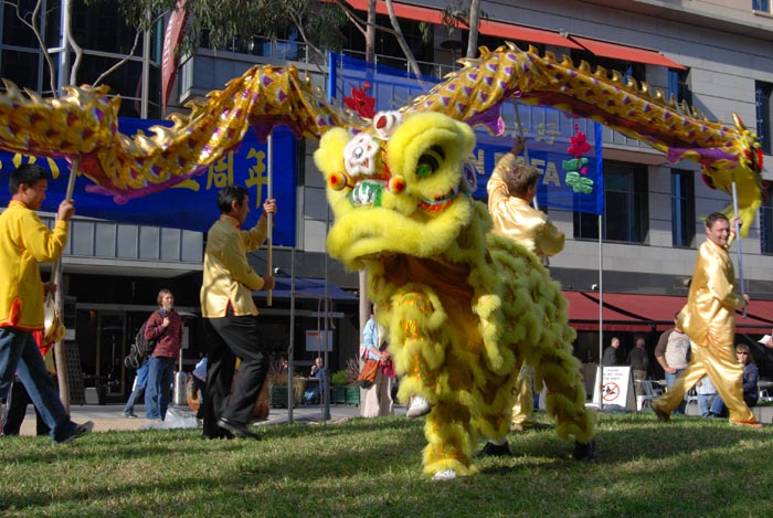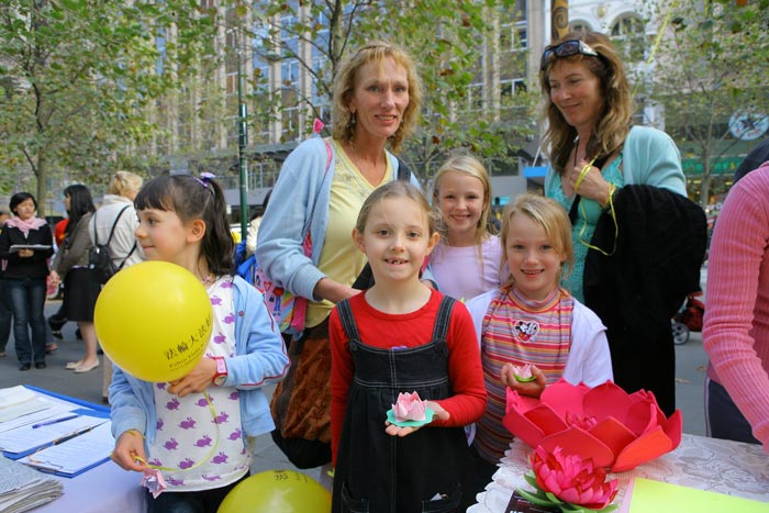 上午,法轮功学员们来到大陆旅游客最多的Fitzroy Garden 集体大炼功。五套功法炼功结束后拍集体照敬拜慈悲伟大的师父,祝贺师尊生日快乐。之后在位于墨尔本市中心的城市广场举行了庆祝活动。学员们通过歌舞表演以及街头音乐剧,展现了法轮大法洪传的历程以及多国西人学员上天安门证实法的壮举,吸引了许多路人的观看。同时,一旁折莲花的活动吸引了孩子们的目光。庆祝法轮大法日的黄色气球成了孩子们的最爱,飘满市中心的主要街道。