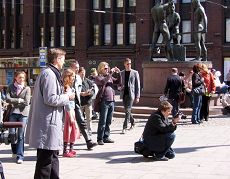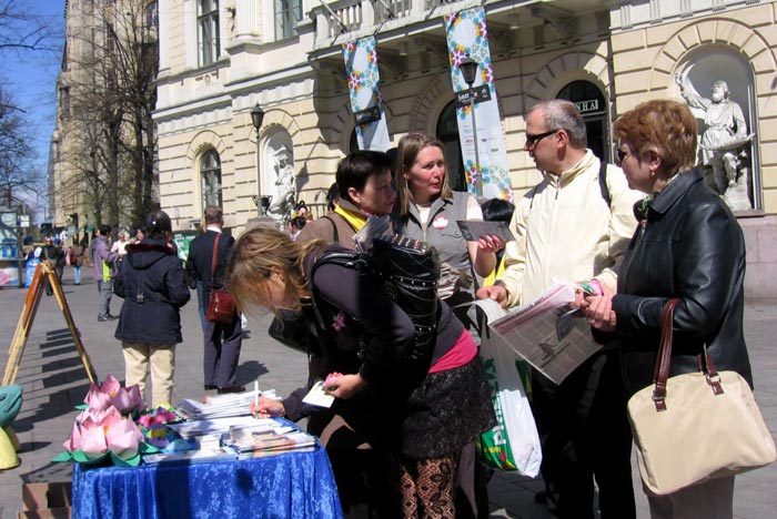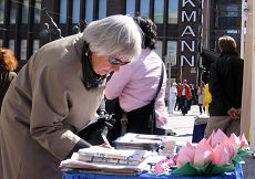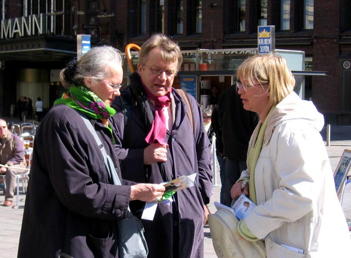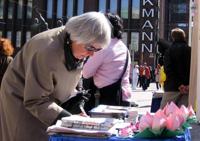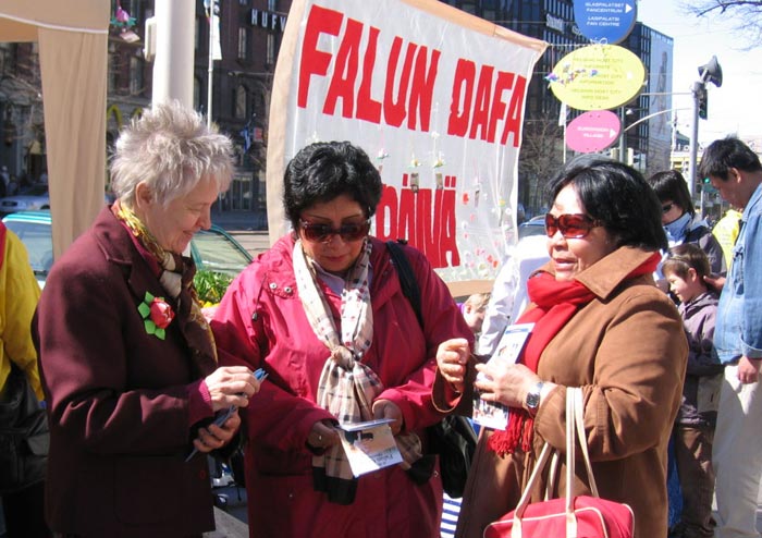 ![]() 秘鲁籍的母女俩对法轮功有极大的兴趣,知道了赫尔辛基炼功点的地址后非常高兴,接着又签名声援 |