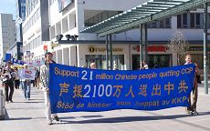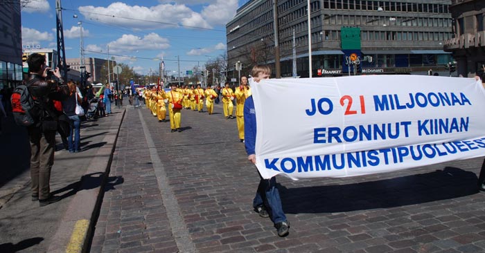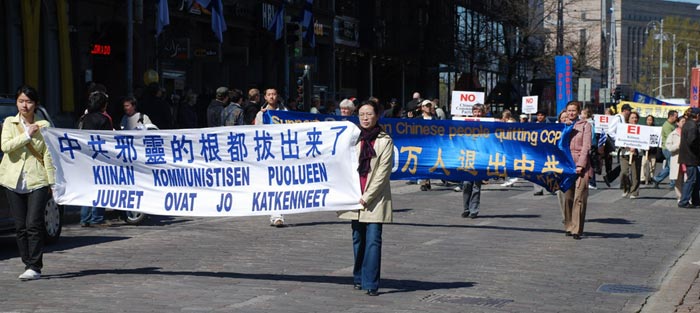 集会结束后,由警车开道,身穿中式运动服装的腰鼓队领头,随后人们举着各种声援退!党!的横幅与标语牌,在赫尔辛基闹市区进行了游行。