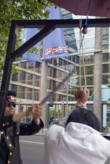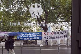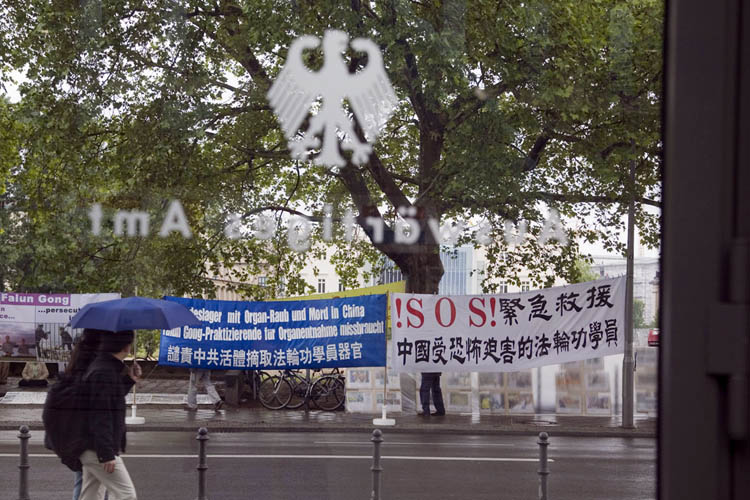 对话第一天因是闭门对话,德国外交部门口一如平常,没有媒体出现,只有法轮功团体在街对面打出醒目大横幅,提醒与会双方这一炼功团体在中国还在被中共残酷迫害,甚至被活摘器官。