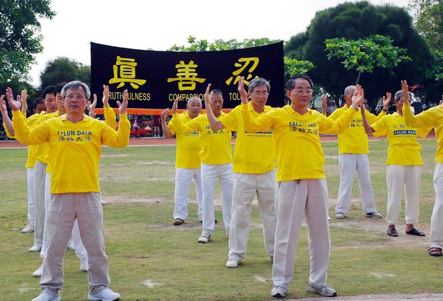 当天早晨,将近一百位法轮功学员在过沟国小的校庆典礼上演示五套功法,优美的动作及悠扬的炼功音乐吸引了教职员及学生的目光,许多附近的居民及渔民听到消息,都放下手上的工作跑来观看,有的渔民戴着斗笠、包着布巾,站在艳阳下静静的观赏功法演示。
