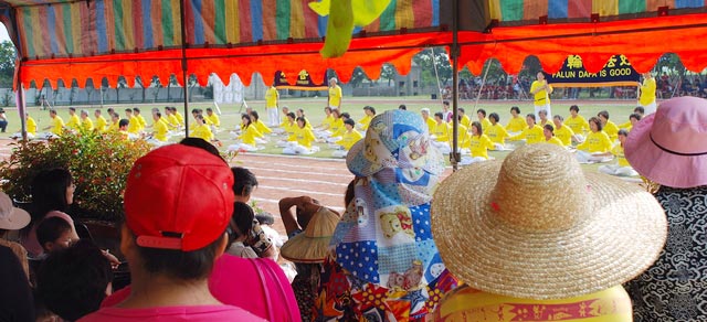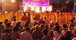 晚会第一个节目安排法轮功学员演示五套功法,学员们整齐的排在舞台前,小弟子则站在舞台上,他们展现了功法的祥和殊胜,赢得广场上市民的热烈掌声。