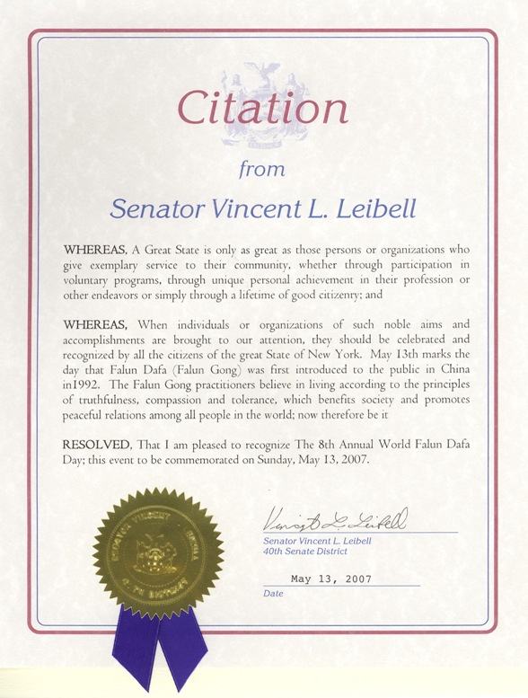 鉴于,当这样高尚的目标和成就引起我们注意的时候,他们应得到全体大纽约州公民的祝贺和认可。五月十三日标志着法轮大法(法轮功)于一九九二年在中国首次向社会传出。法轮功学员遵循“真、善、忍”为生活准则,这有益于社会,并促进世界人民之间的和平,鉴此