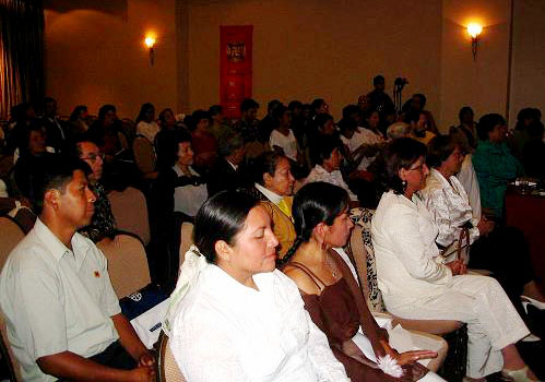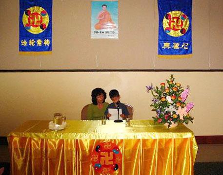 到会发言的学员都为西人学员,除一名来自澳大利亚西的之外,其余都居住在秘鲁;其中一名是年仅七岁小弟子希安弗蓝科(Gianfranco),他由妈妈陪伴上台发言,他说自己四岁时,就跟着姐姐炼功、和学《转法轮》。他说,他会照师父的话去做,并说,当自己知道贪玩游戏机的执着心是不好的时候,就用正念清除它。