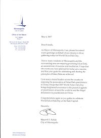 我知道明尼阿波里市的居民和周遭地区都喜欢修炼法轮大法这一古老的修炼方法。我希望你们法轮大法日的活动圆满成功,达到庆祝并分享法轮大法原则的目标。