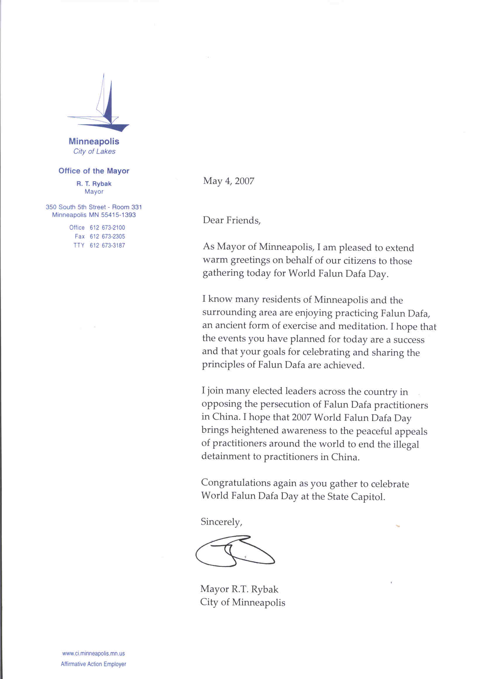身为明尼阿波里市市长,我非常高兴延伸全市的市民对世界法轮大法日热情的祝福。