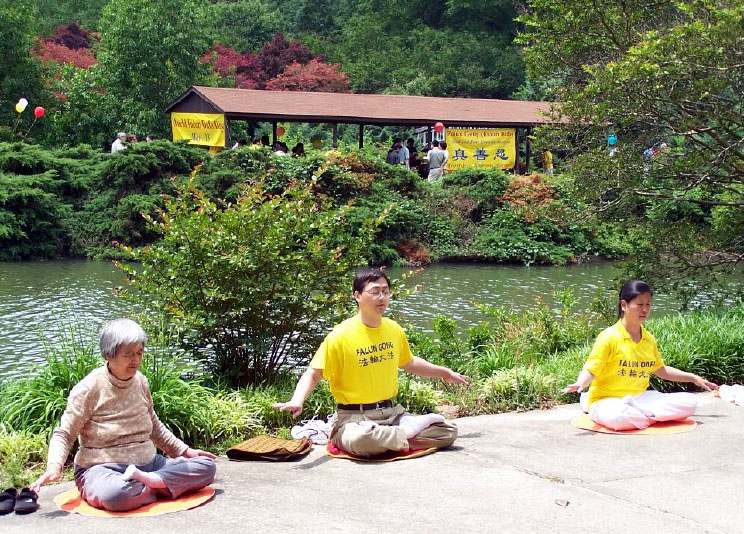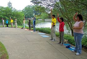 活动在奥尔巴尼的华盛顿公园举行,法轮功学员祥和的功法演示吸引了很多人当场学习。