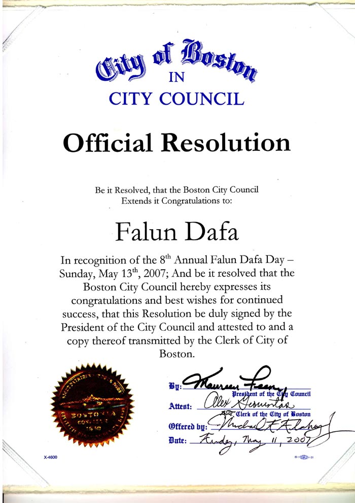 波士顿市议会恭贺并衷心希望法轮大法今后不断成功。
