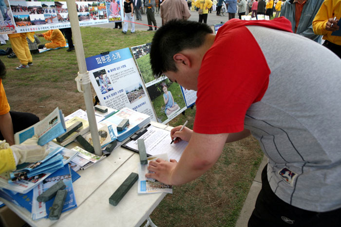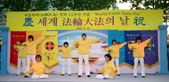 尚未开始修炼法轮功的金周铉律师也来参加了庆祝活动,他说:“听说今天是法轮功洪传十五周年的日子,所以我才来的。虽然我还没有开始修炼,但《转法轮》我已经读了两遍,我知道法轮功追求的是什么,这部功法推崇‘真善忍’,他们追求真理的姿态非常令人感动。”