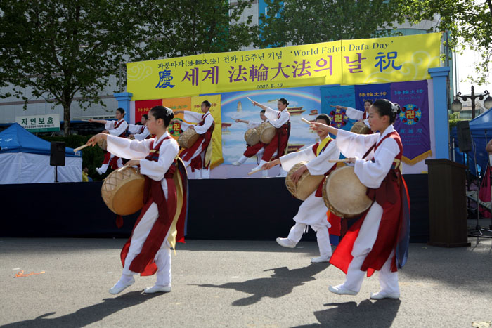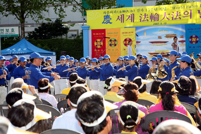庆典开幕词中主持人说:“今天是法轮功洪传全世界十五周年,也是第八届世界法轮大法日。大邱在韩国向来以民众道德水准高而闻名,所以能在这个城市举办这次活动感到很高兴。”台下的观众则以热烈的掌声给予了响应。