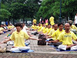 五月十三日下午,巴厘岛数百名法轮功学员聚集在Denpasar市Puputan Badung广场共同庆祝世界法轮大法日。周末的Puputan Badung广场是当地人聚集、休闲的场所。广场上的人在观看了法轮功学员的功法演示后,一些人兴致勃勃的学起功法来,有的甚至也加入到炼功队伍中来。