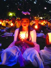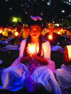 傍晚时分,巴厘岛的学员们举办了烛光悼念活动,悼念在中国大陆为坚持信仰而被迫害致死的三千多名同修。他们通过悼念活动呼吁制止中共迫害法轮功。几百支蜡烛闪耀着金色的光芒,为整个广场增添了凝重的气氛。在场的很多人被感动了。当学员们唱起“梦醒”这首歌时,两位华裔妇女找到了活动的组织者,说她们碰巧路经广场,听到了悠扬悦耳的音调和歌词,这首歌令她们非常感动。