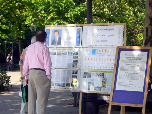 ![]() 两位德国男士在图片与文字前驻足观看,细细阅读,详尽了解了法轮功是什么和中共对法轮功进行迫害的邪恶动机。 |