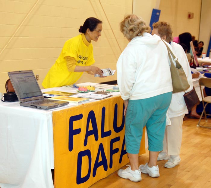 主办人弥敦(Sonia Nathan)赞扬法轮功学员对社区的服务,并请学员担当比佛利山医院健康讲座的讲员,介绍法轮功。