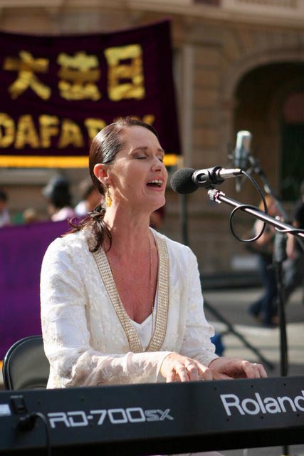 另外一个乐团成员Glenda Traub也是一位有着二十多年演唱生涯的专业歌手,她表示修炼法轮功八年来,给她的身心和精神都带来了很多奇迹般的变化。她过去曾受过伤,身体虚弱,一直没有孩子,修炼后她摆脱了身体的疾病,感到一身轻,并获得了心灵的宁静,如今还生了女儿,已经五岁多了。今天她带着一颗感恩的心,感到非常激动和荣幸能够来悉尼参加世界法轮大法日的活动。中国正在发生的迫害令她感到悲哀,她希望能够尽早结束这场迫害。
