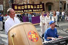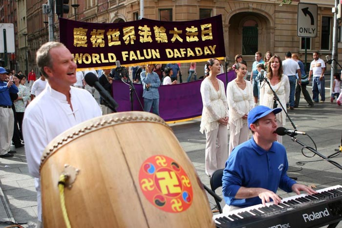 在众多华人表演者中,两支由西人法轮功学员组成的英文合唱组格外引人注目。他们是来自悉尼的佛性乐队(Buddha Nature)和特意从昆士兰赶到悉尼来参加庆祝活动的照亮乐队(Illumination)。他们发自纯净心灵的歌声,感染了观众,也吸引了包括很多华人在内的路人驻足聆听,赢得了观众由衷的掌声。