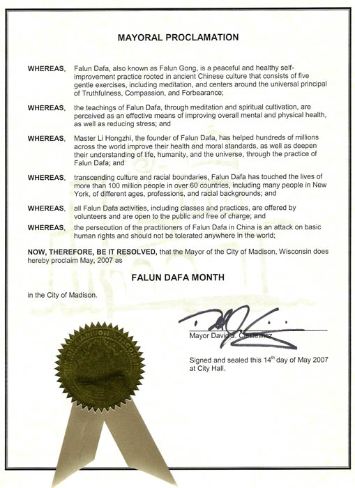 因此,我,威斯康星州麦迪逊市市长宣布二零零七年五月为麦迪逊市