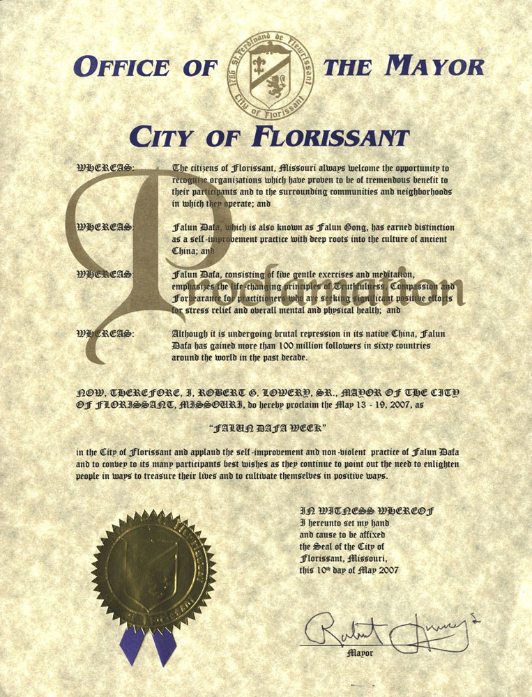 鉴此,我,罗伯特.劳瑞,密苏里州伏洛瑞森特市市长,特此褒奖二零零七年五月十三至十九日为伏洛瑞森特市“法轮大法周”,并且赞扬法轮大法提倡的自我提高和非暴力,对其众多的修炼者表达最诚挚的祝福,祝愿他们继续指出人们需要觉悟,应当珍惜生命和修炼自己。