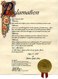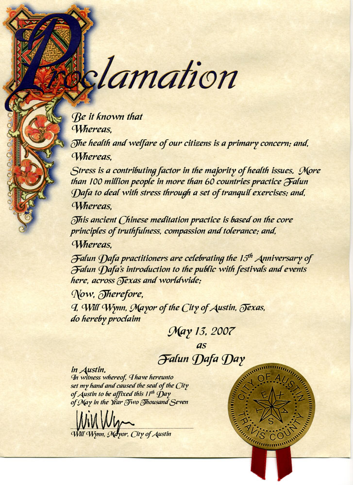 鉴于,法轮功修炼者在德克萨斯州和全世界举行节日活动,庆祝法轮大法洪传十五周年;