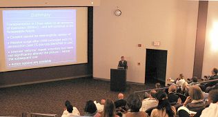 Lefrak教授的演讲围绕着医学机构应如何对待盗取器官这种违反人性的行为,是否应该停止培训来自中国的器官移植医生,还是应对来培训的器官移植医生加强医学伦理道德的教育;如果只是加强对医生的伦理道德教育,在象中国那样的独裁体制下,对制止活摘器官行径能否起到任何作用等议题展开。
