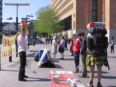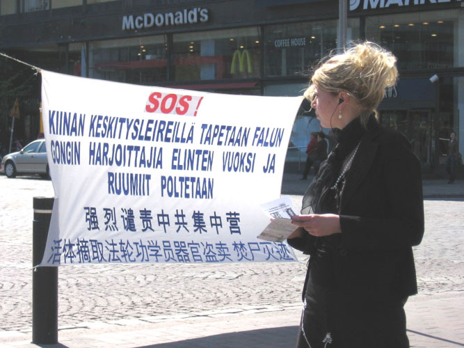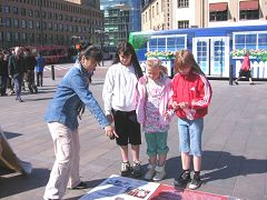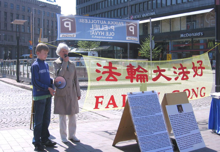 ![]() 芬兰学员Sinikka在小儿子Samuli的帮助下一遍遍的用高音喇叭向过往行人讲述着法轮功的真相 |