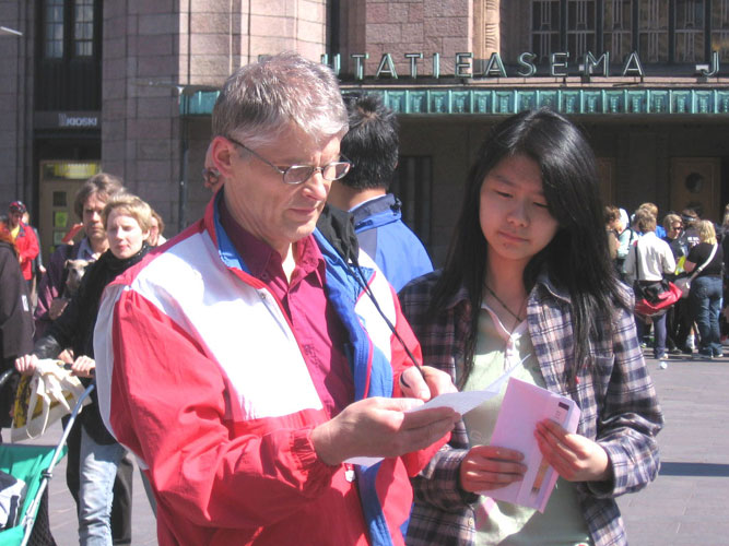 芬兰学员Sinikka让小儿子Samuli帮她拿着高音喇叭,她则一遍遍的向过往行人讲述着什么是法轮功以及中共对法轮功修炼者残酷迫害的真相,同时也告诉人们赫尔辛基的炼功点的地址和时间。就看到一位女士听着讲解,手随着演示功法的学员比划着炼功动作。