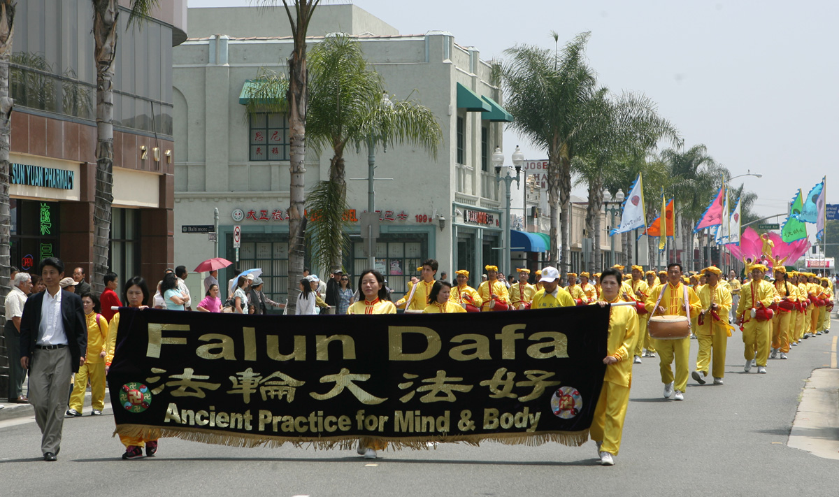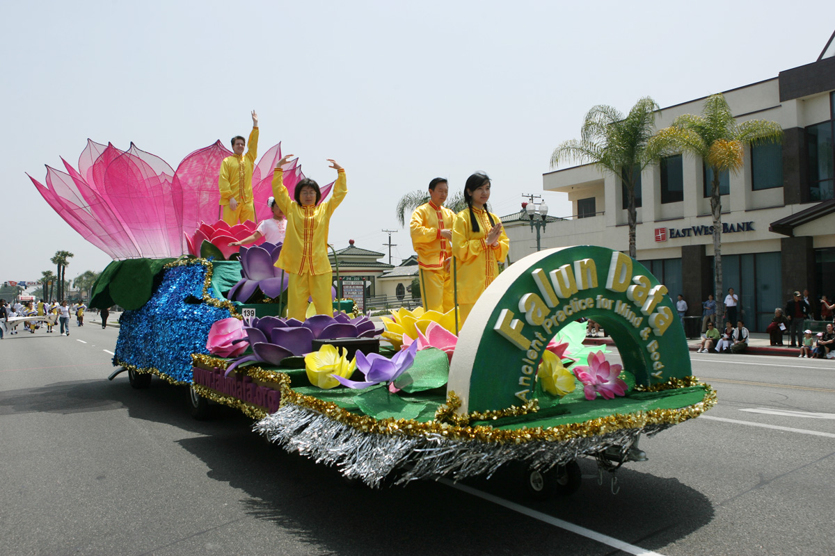 法轮功代表队是游行队伍中的大型队伍之一,队伍的最前面是「法轮大法好」大横幅,随后是腰鼓队、舞蹈队、彩旗队和主体为巨大粉红色莲花的花车。莲花由粉红色的薄纱制成,巨大的花瓣向外伸展着,在阳光下格外醒目。花车前方装有五颜六色的莲花,几位学员站在上面演示功法。一路上,威武雄壮的腰鼓、典雅秀丽的唐装舞,以及花车上的功法演示,向大众展示了真善忍的美好,沿途不断有观众向法轮功学员招手、鼓掌。游行结束后,法轮功队伍获得花车一等奖、舞蹈二等奖。