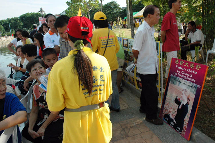 早上九时左右,来自台湾大约两百人组成的法轮大法天国乐团助阵,吹奏“法轮大法好”、“法正乾坤”、“送宝”和“法鼓法号震十方”。震撼人心的鼓乐吸引观众围看和争相拍摄。学员也在现场摆放真相资料、展板,让来自全马各地以及新加坡来观看龙舟赛的人士有机会了解真相。