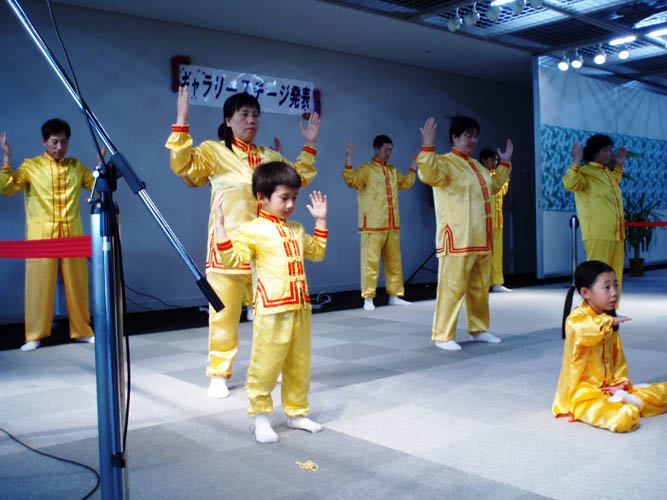 舞台表演之前,法轮功学员们首先为来宾播放了法轮大法在世界洪传的录像,然后带领观众一起炼功。祥和的能量笼罩着每个人,人们认真的在学习,好象期待很久的样子。
